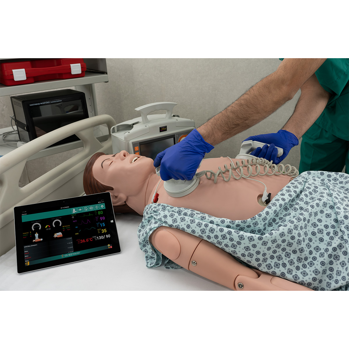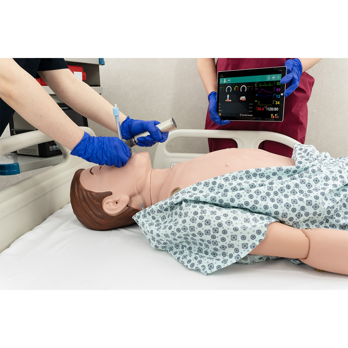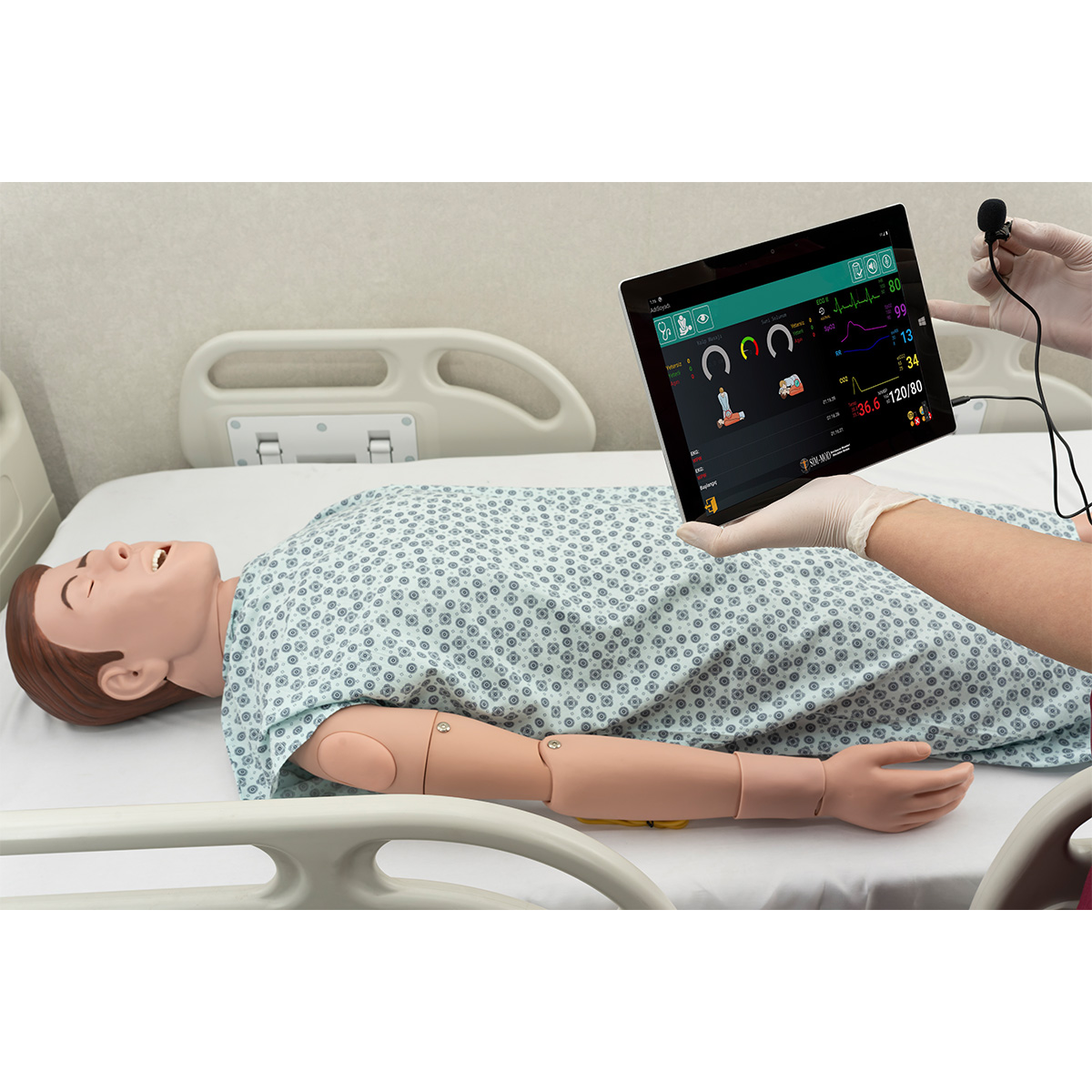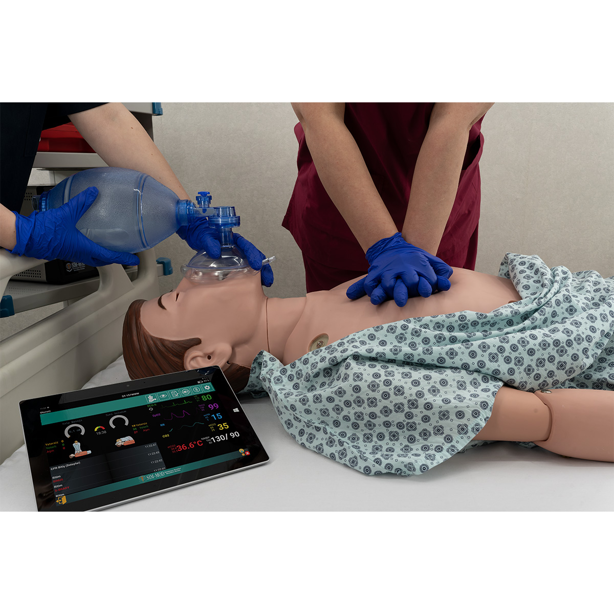 - A 12-inch tablet is provided. It can connect to the manikin wirelessly to function as the control panel. This control panel enables the monitoring of various procedures, including CPR, pulse management, ECG, intubation, spontaneous respiration, pupil control, blood pressure measurement, application feedback, and vocalization.