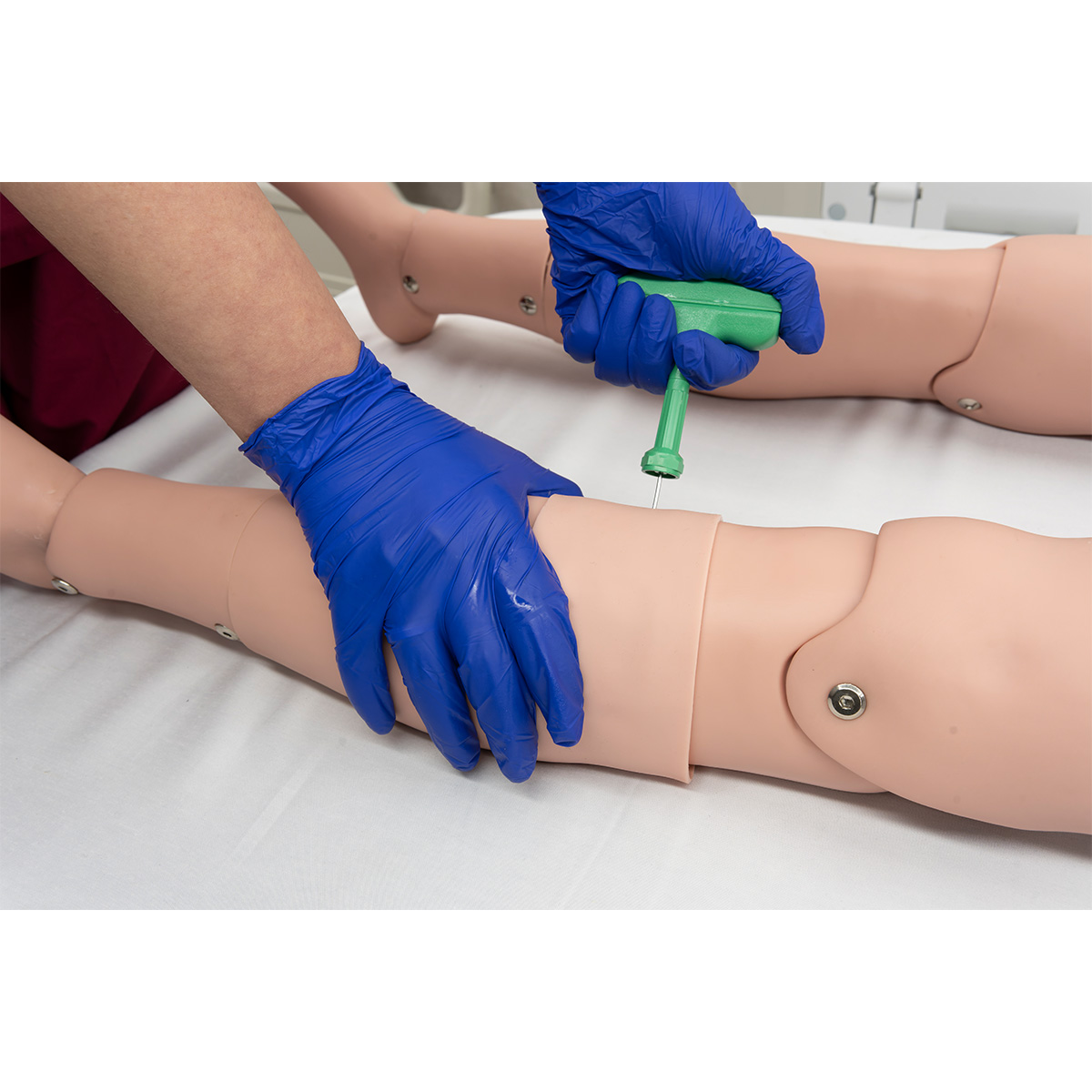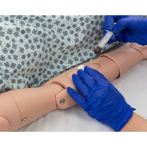 - Intraosseous infusion (IO) procedure can be practiced on the left leg. The procedure can be made more realistic by using simulative blood fluid within the bone modules.