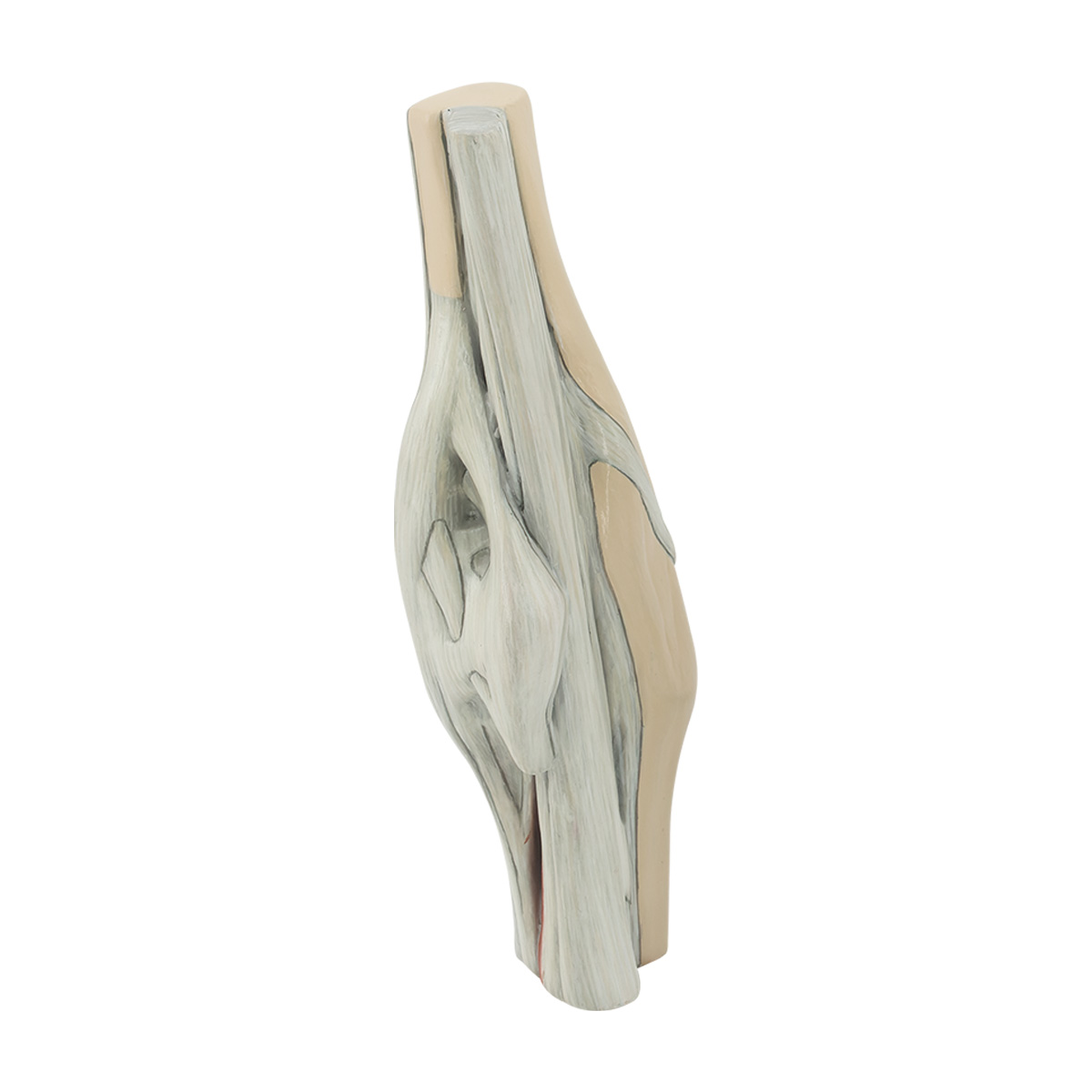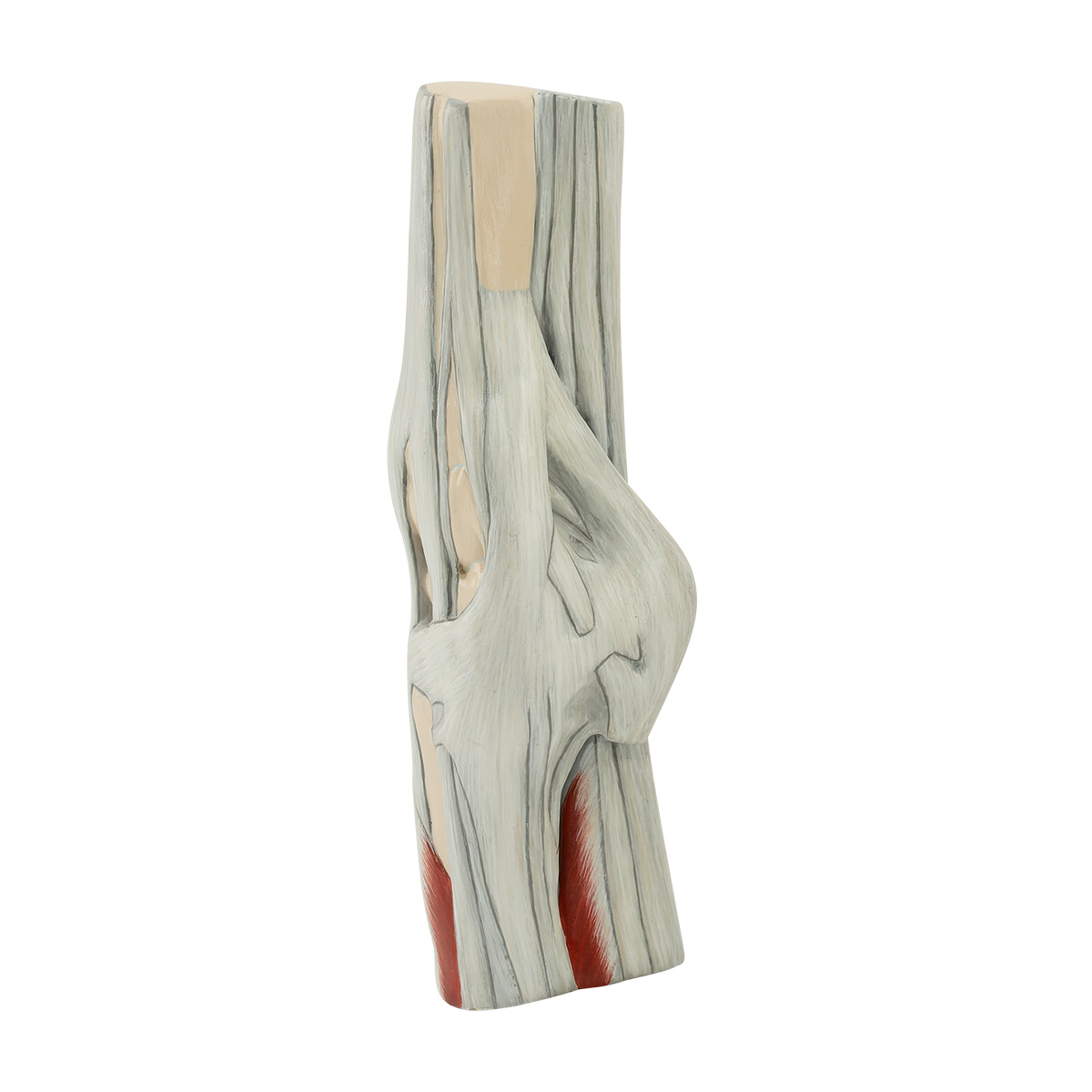 This model is crafted from specialized plastic and is in its natural size. The model shows the tendons and ligaments surrounding the joint. It is mounted on a base.