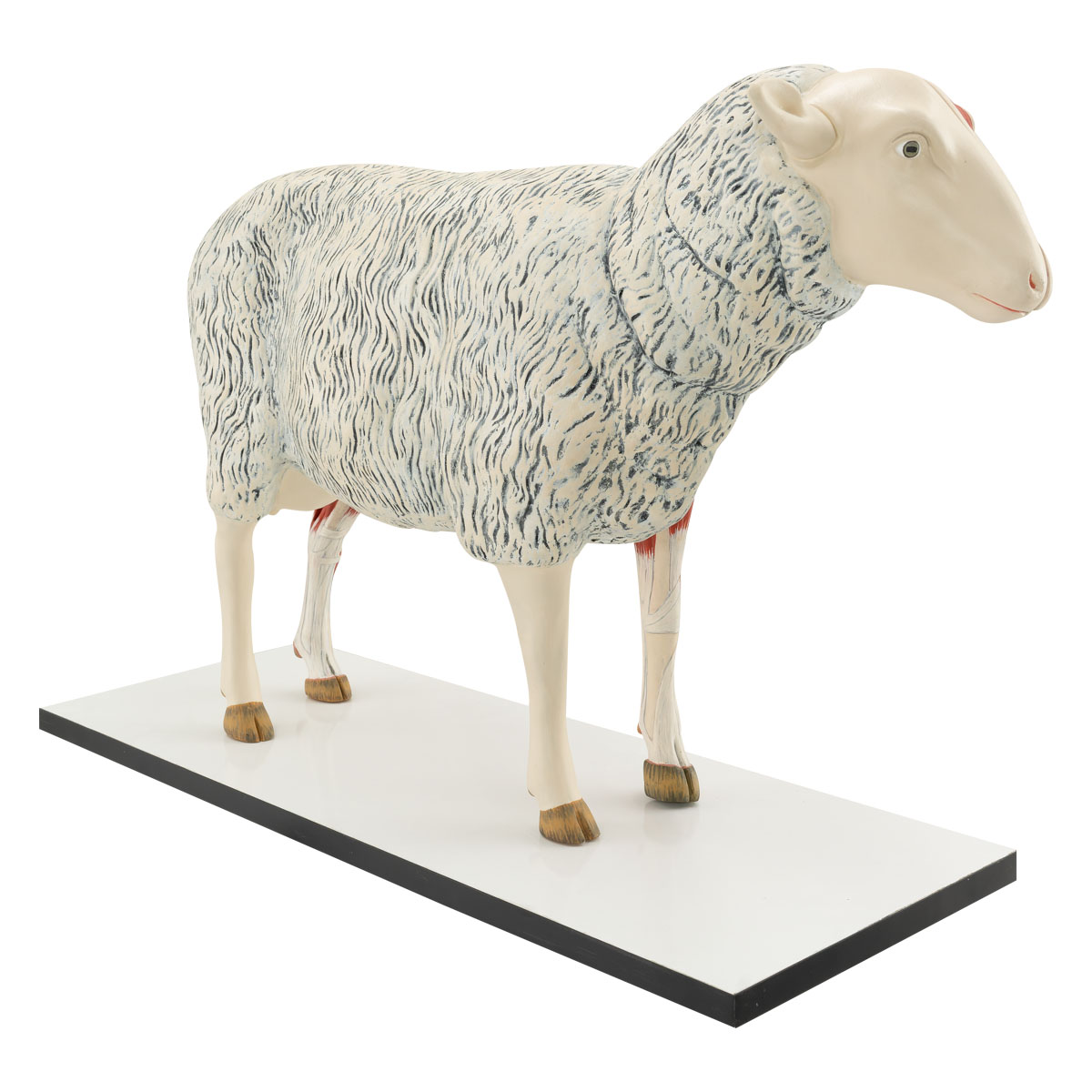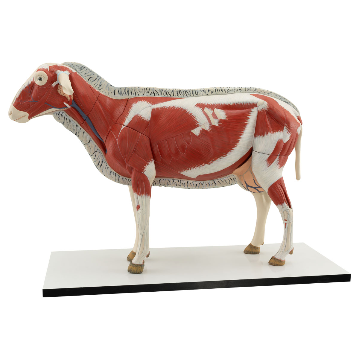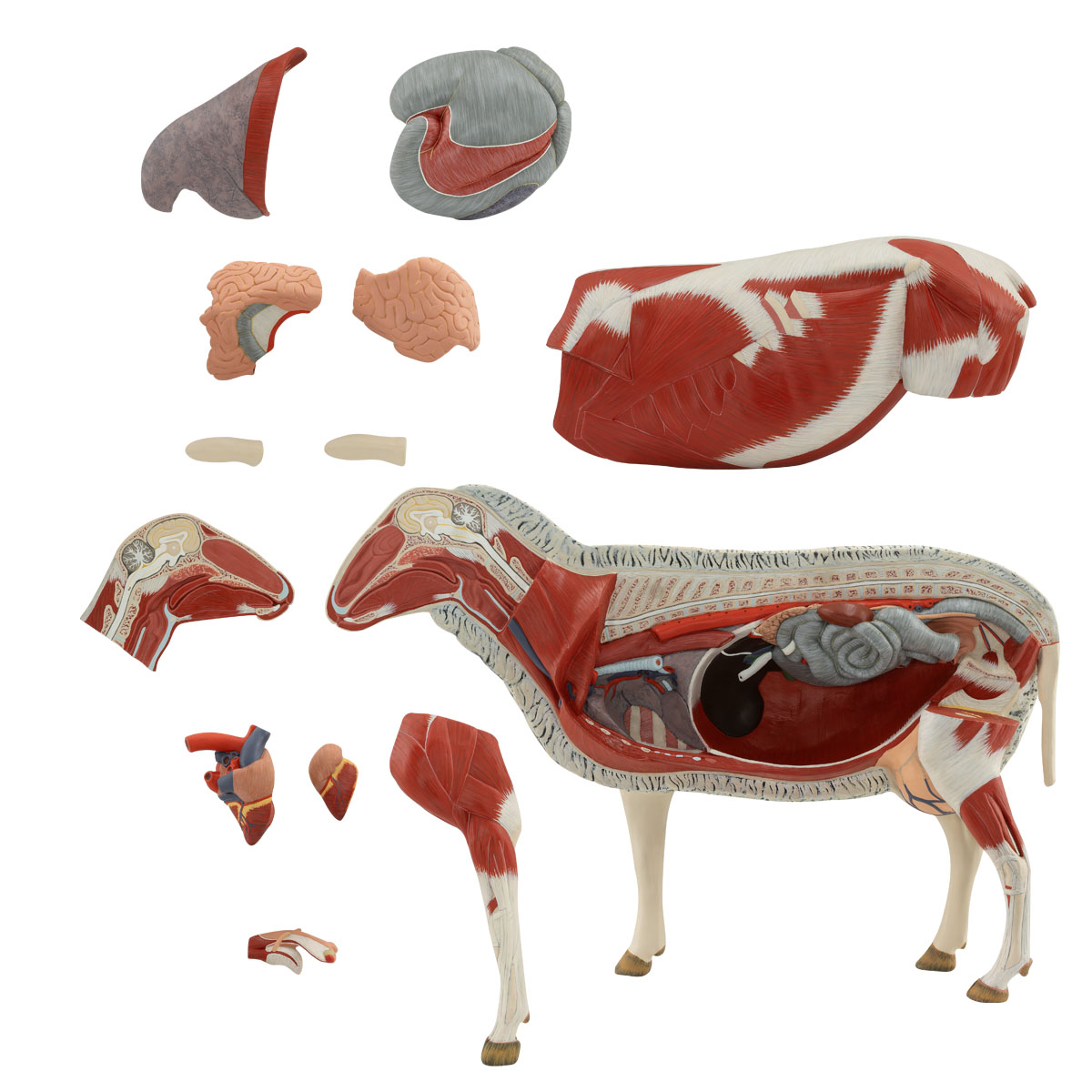 This model is crafted from specialized plastic and is scaled down to 2/3 of its natural size. One side of the model shows the textured woolen fur of a sheep, while the other side shows the muscular system. The model is composed of 13 detachable parts, including the front leg, left half of the head, both ears, abdominal wall, heart (2 pcs), stomach, left half of the lung, uterus, and small intestine (2 pcs).