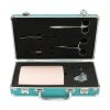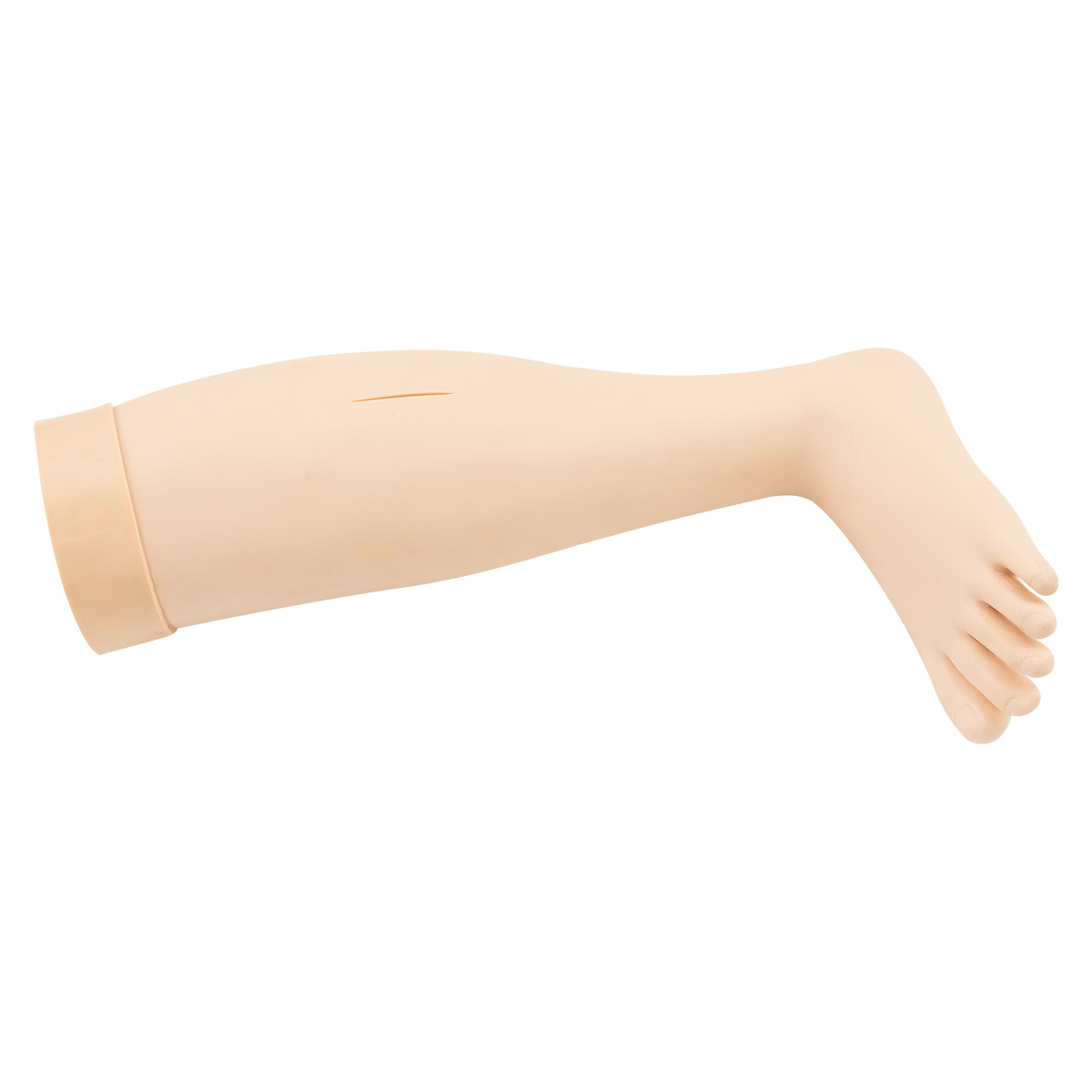 The model simulates the below the thigh of an adult human’s right leg. It has a realistic appearance and anatomical structure. It is made of special plastic to be used in suture training. Skin layers can be seen through the cuts on the model.