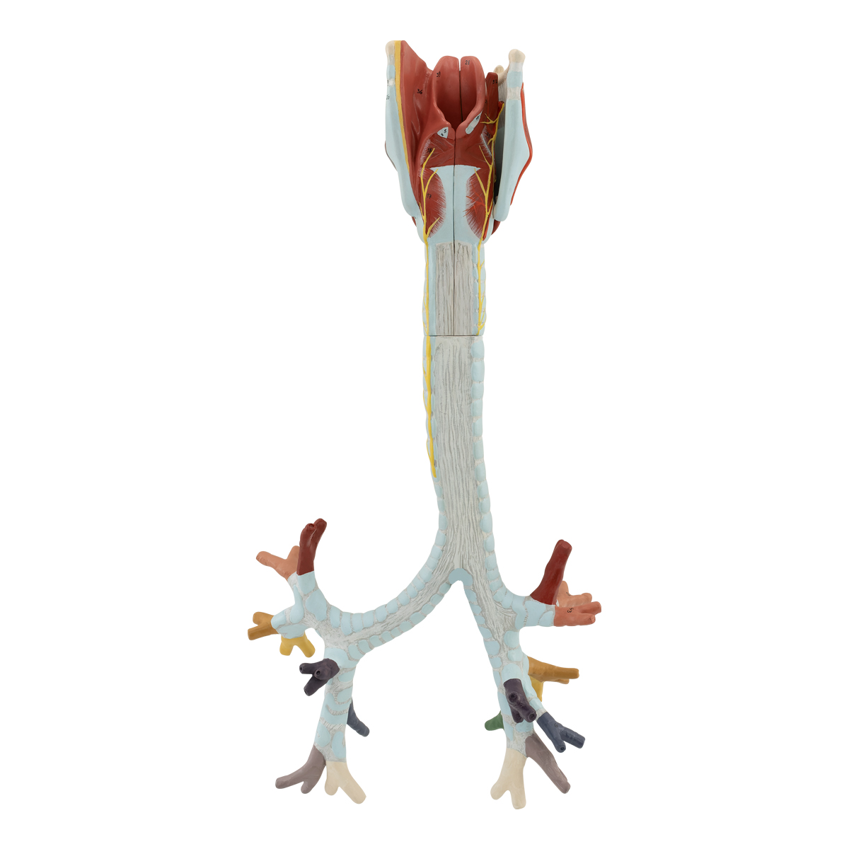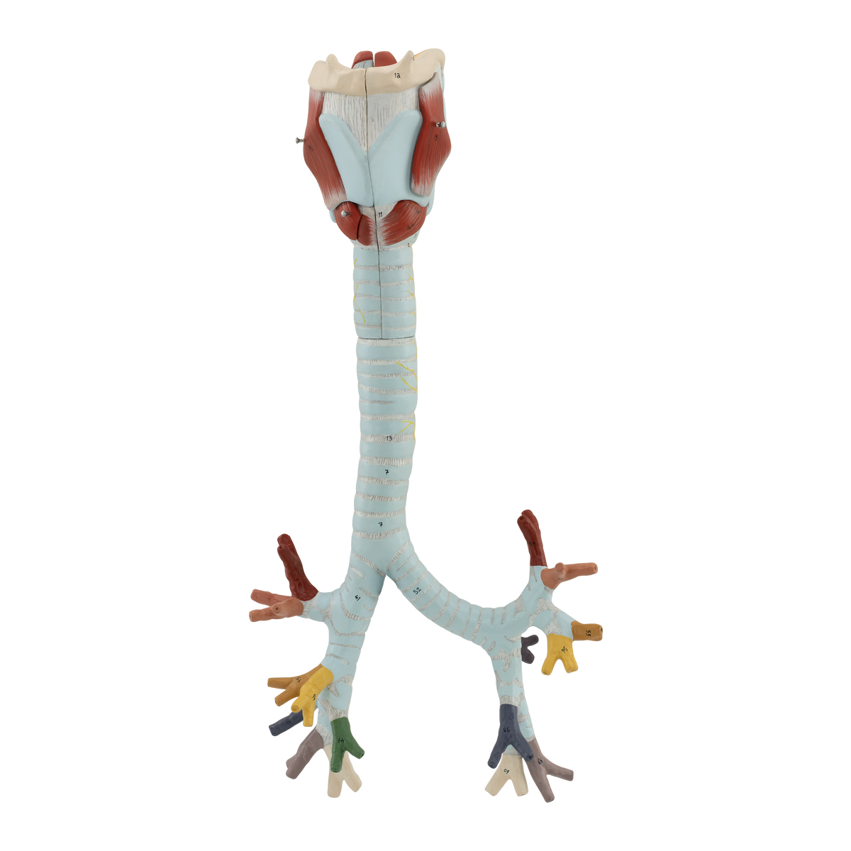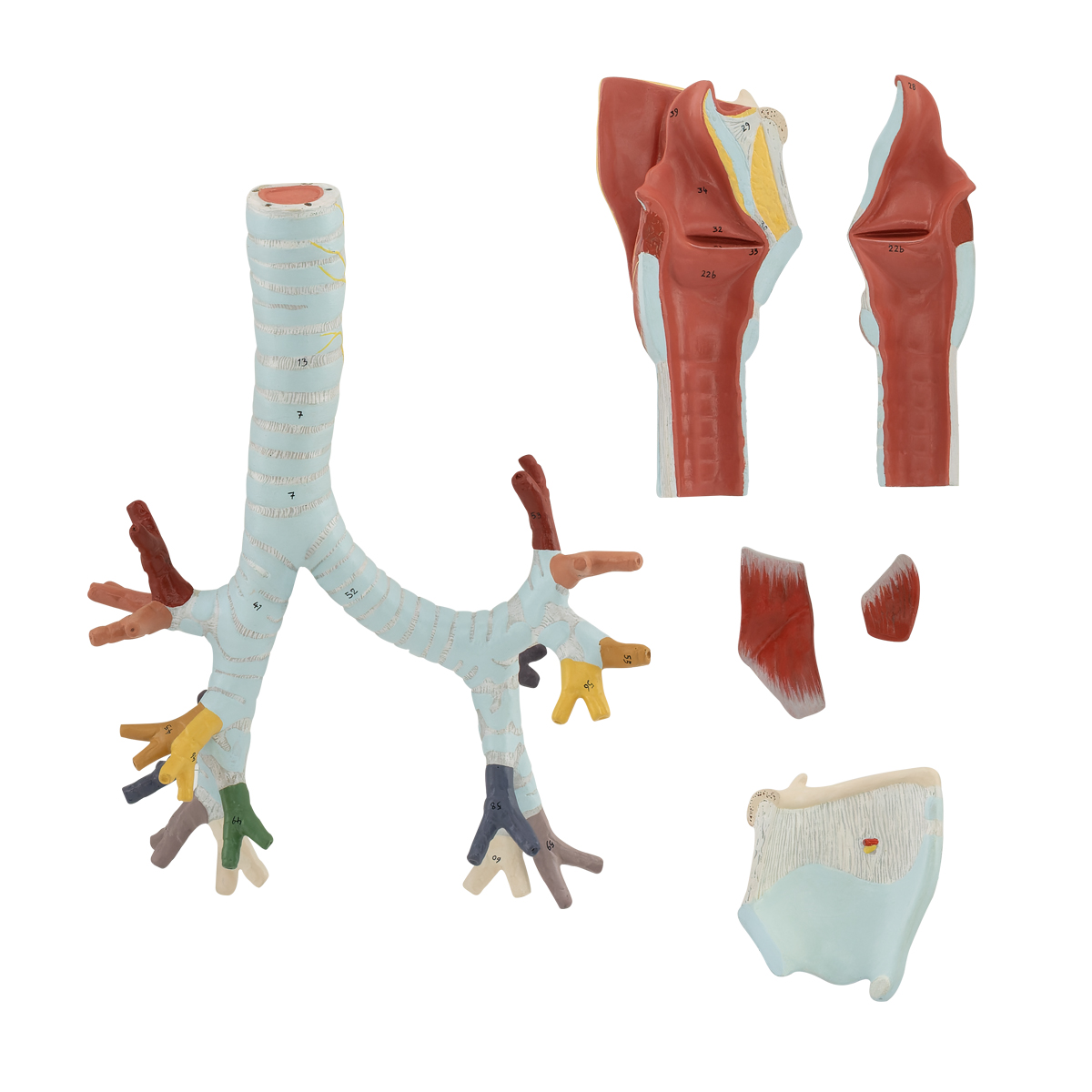 Özel geliştirilmiş plastikten imal edilmiş olup normal boyutlara göre yaklaşık olarak 2 kez büyütülmüştür. Toplamda 6 parçadan oluşmaktadır. Larinks ve trakea 6. trakeal kıkırdak seviyesinden ayrılabilmektedir. Larinks median kesitte 2 yarıya ayrılır. Sağ tiroid kıkırdağı, m. cricothyroideus ve m. thyrohyoideus çıkarılabilmektedir. Trakea, ana bronşlara bölünme noktasını ve lober bronşlara dallanmayı göstermektedir. Model bir kaide üzerine montelidir.