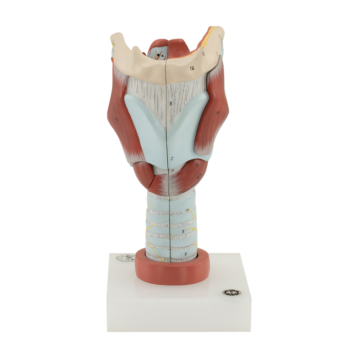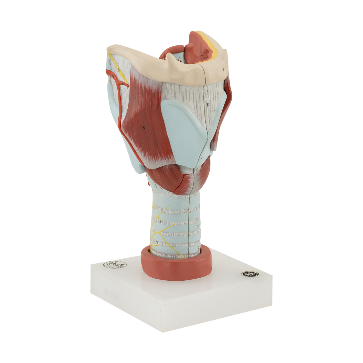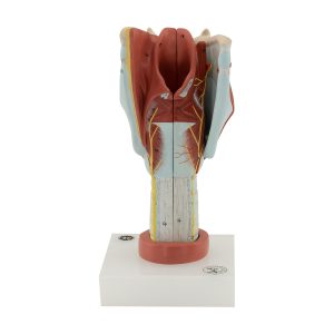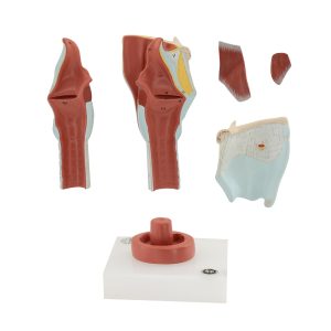 Özel geliştirilmiş plastikten imal edilmiş olup normal boyutlara göre yaklaşık olarak 2 kez büyütülmüştür. Toplam 5 parçadan oluşmaktadır. Model orta hattan 2 parçaya ayrılmaktadır. Ayrılabilen parçalar: Sağ thyroid kıkırdak, m. cricothyroideus ve m. thyroihyoideus’dur. Larinksin iç ve dış kasları, mukoz membranı, arter ve sinirleri ve kıkırdak yapı görülmektedir. Bir kaide üzerine montelidir.
